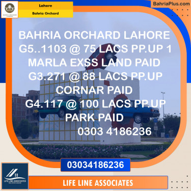 BAHRIA ORCHARD LAHORE G5..1103 @ 75 LACS PP.UP 1 MARLA EXSS LAND PAID G3.271...